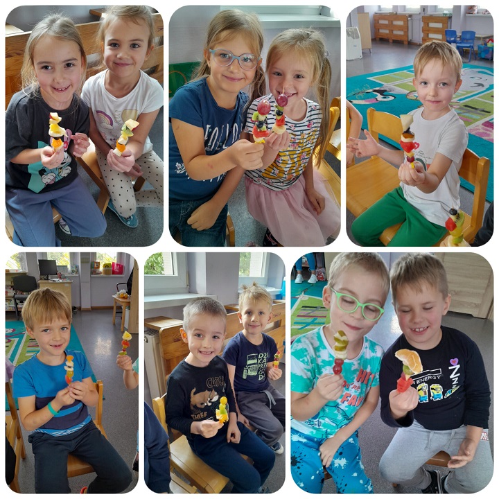 utrwalały wiadomości o owocach i warzywach. Odpowiadały między innymi na pytania: Skąd owoce trafiają na nasz stół? Ile kosztują nasze ulubione owoce zjadane na podwieczorek? Odpowiedź na kilka pytań uzyskaliśmy w sklepie spożywczym podczas ,,owocowych zakupów". W sklepie sprawdzaliśmy i porównywaliśmy ceny owoców krajowych i zagranicznych, na koniec kupiliśmy potrzebne produkty na owocowe szaszłyki. To były smakowite zajęcia na podsumowanie całego tygodnia.