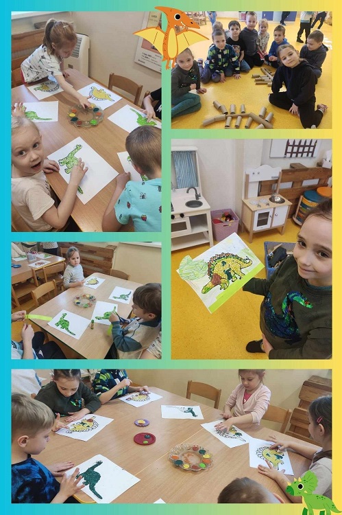 Dzieci miały okazję zaopiekować się najprawdziwszymi jajami dinozaurów, przejść się tropem jednego z tych ogromnych gadów, a nawet poznać kilka ciekawych faktów z ich życia. Czy wiedzieliście, że stegozaur rozmiarem przypominał autobus lub, że szyja diplodoka miała aż 6 metrów długości? Dzieci zorganizowały także kącik edukacyjny, w którym zgromadziły książki, gry planszowe, puzzle oraz figurki swoich ulubionych dinozaurów. W sali wiszą przepiękne prace Kotków - głównym elementem tej aktywności było malowanie palcami, czyli świetne ćwiczenie z zakresu motoryki małej.
