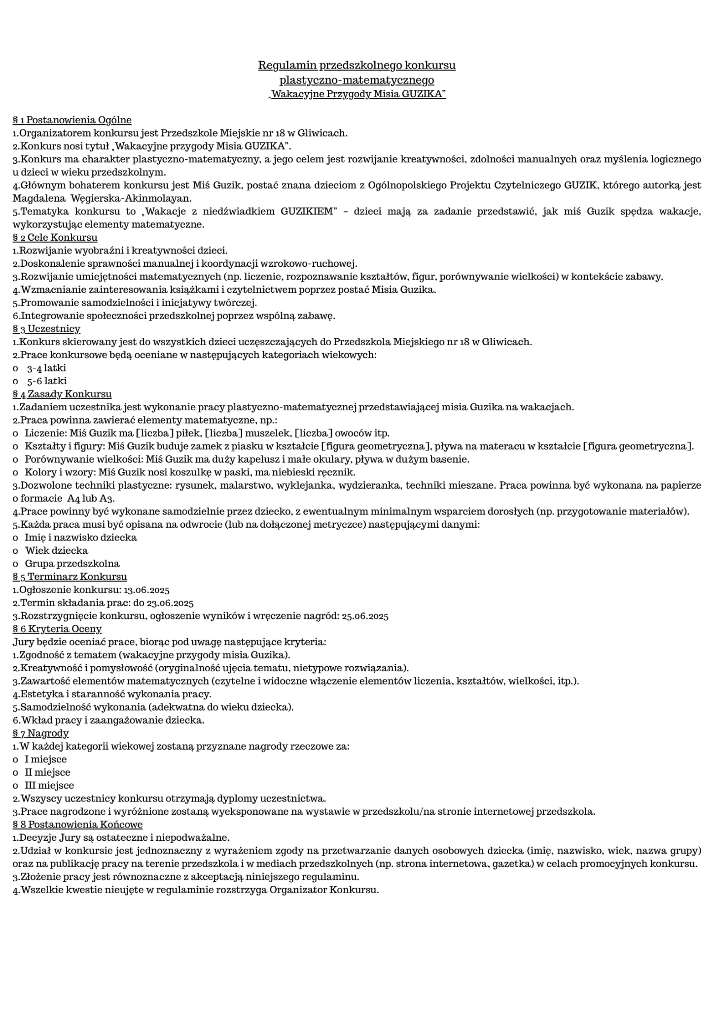 Z wielką radością zapraszamy wszystkie przedszkolaki do wzięcia udziału w naszym konkursie plastyczno-matematycznym! Przygotujcie się na „Wakacyjne Przygody Misia Guzika” – to wyjątkowa okazja, by razem z naszym ulubionym bohaterem z projektu czytelniczego wyruszyć w pełną kreatywności i nauki podróż!