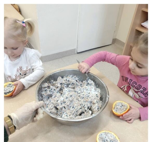 Podczas zajęć dzieci: Samodzielnie przygotowały "ptasie pyzy" – mieszały ziarna i nasiona z naturalnym tłuszczem w wielkiej misie. Wykorzystały ekologiczne karmniki