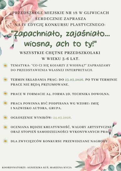 Serdecznie zapraszamy do udziału w konkursie plastycznym "Zapachniało, zajaśniało... Wiosna, ach to Ty!". Szczegóły znajdziecie Państwo w poniższym plakacie, lub u koordynatorów konkursu - p.Kuś, p.Kycia.